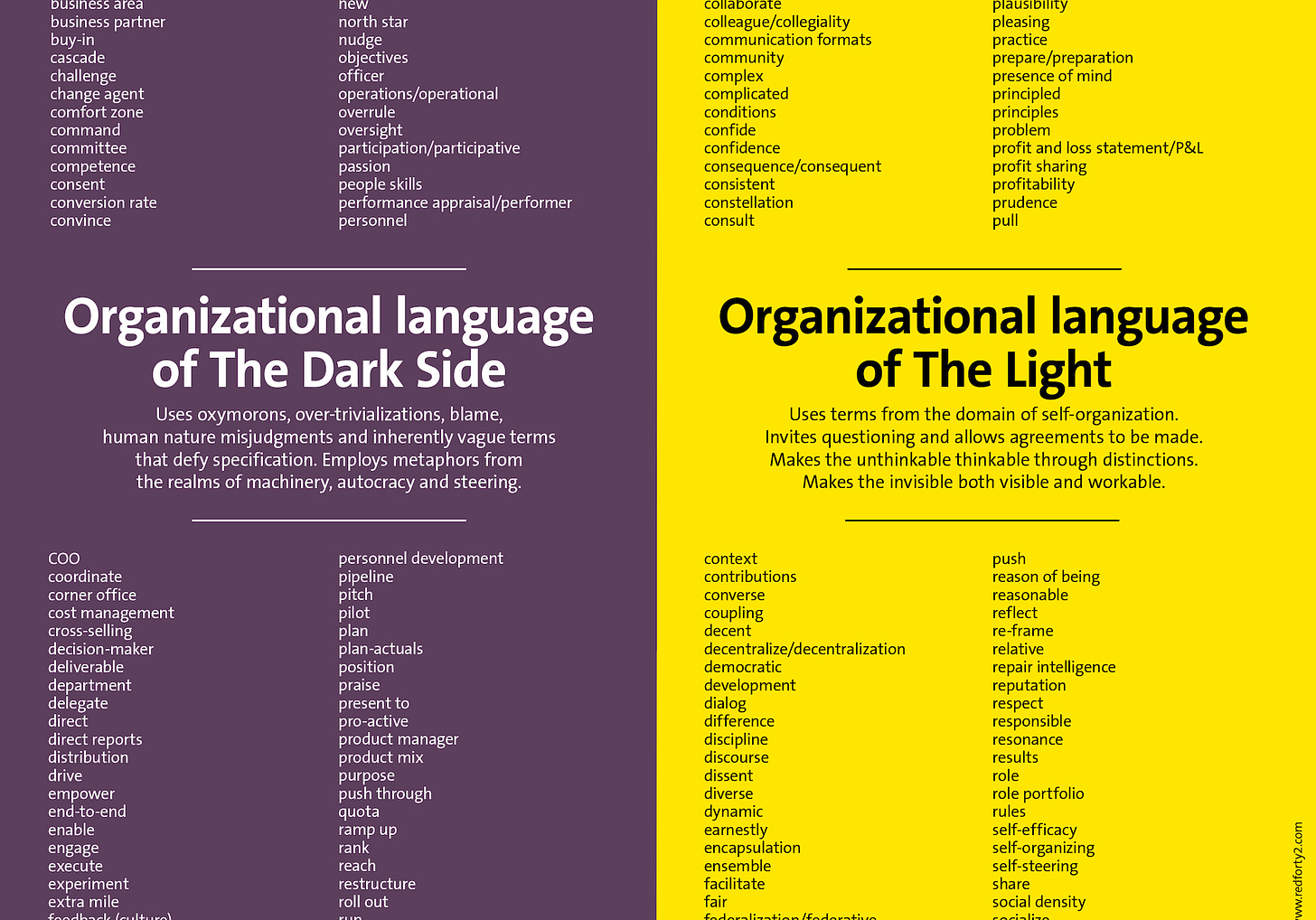 So if you want to bring proper self-organization, decentralization and Beta to organizations - your own organization or those of your clients – how will you achieve that with common, vulgar, exchangeable words and language? There is no way around deploying edgy, crisp and pointy language. If you long for suggestions about what kind of words to fight, and what kind of vocabulary to embrace, then the Power of Language poster that