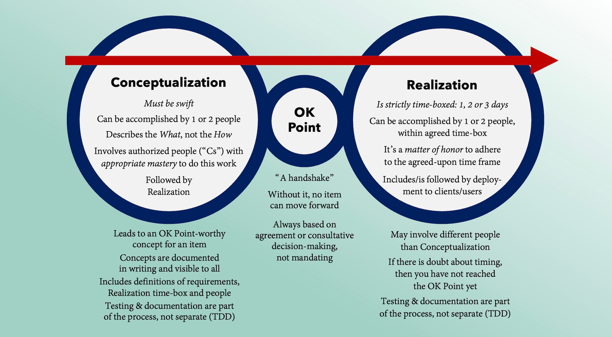 The OK Point allows for Realizers and Conceptualizers to self-organize the development process, by consulting with each other and by agreeing about passing on an item from one stage to the other. No central coordination by managers or supervisors is necessary. Such coordination, allocation, scheduling or planning would be counter-productive, in fact. Realizers and Conceptualizers may consult managers (or the List Owner), but the rule of the game is that it’s their decision to come to an agreement, at the OK Point. Realizers are then bound by the scope outlined in the concept, and by the time-box that comes with the item - which may be 1 day, 2 days or 3 days.