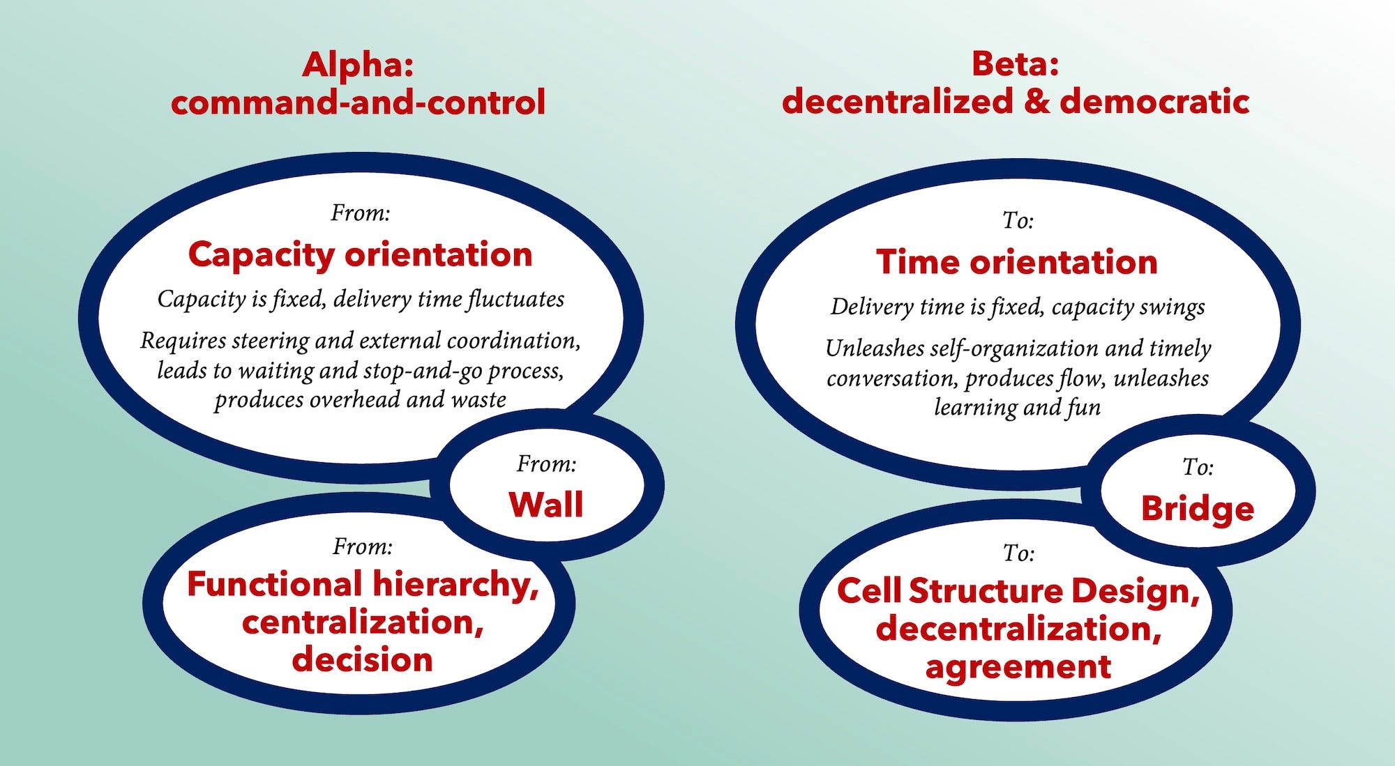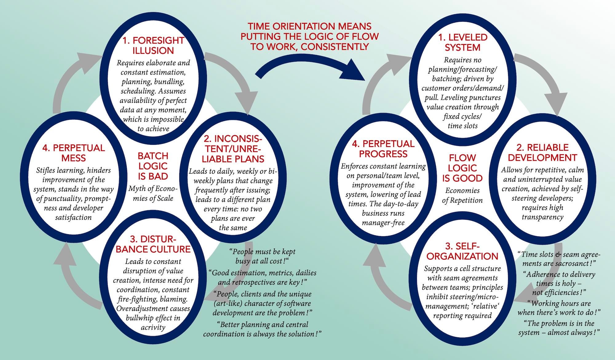 In effect, we have to choose between two models of organizing software development: Either according to notions of Capacity orientation, with centralized decision-making and intense steering, or according to Time orientation, with fixed delivery times and highest levels of self-organization. Only the latter allows for flow and high performance (see illustration).