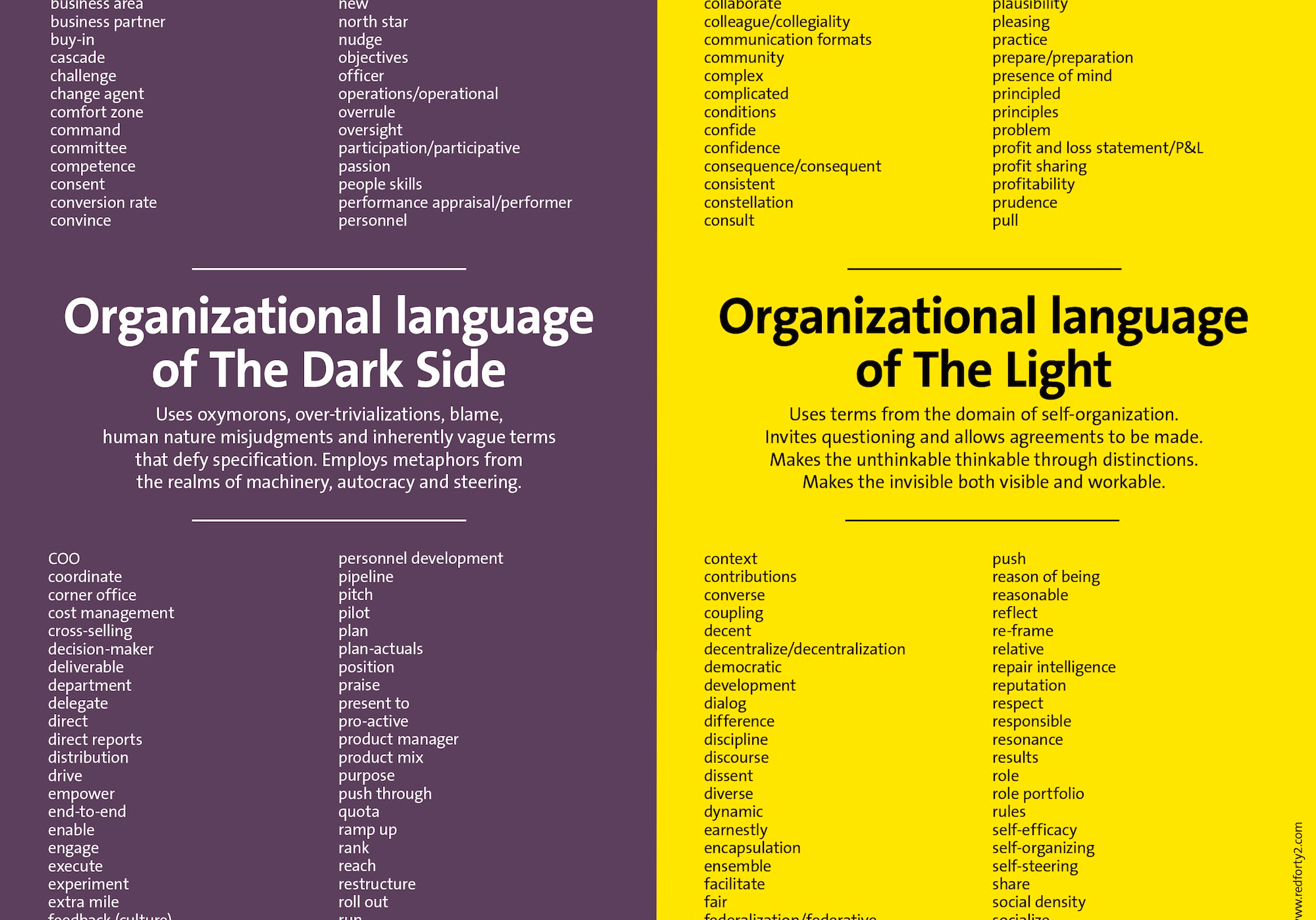 Red42 releases a new poster called The Power of Language: It covers 320 words and terms, from "The Dark Side" of organizational language and an alternative, more useful language of "The Light"